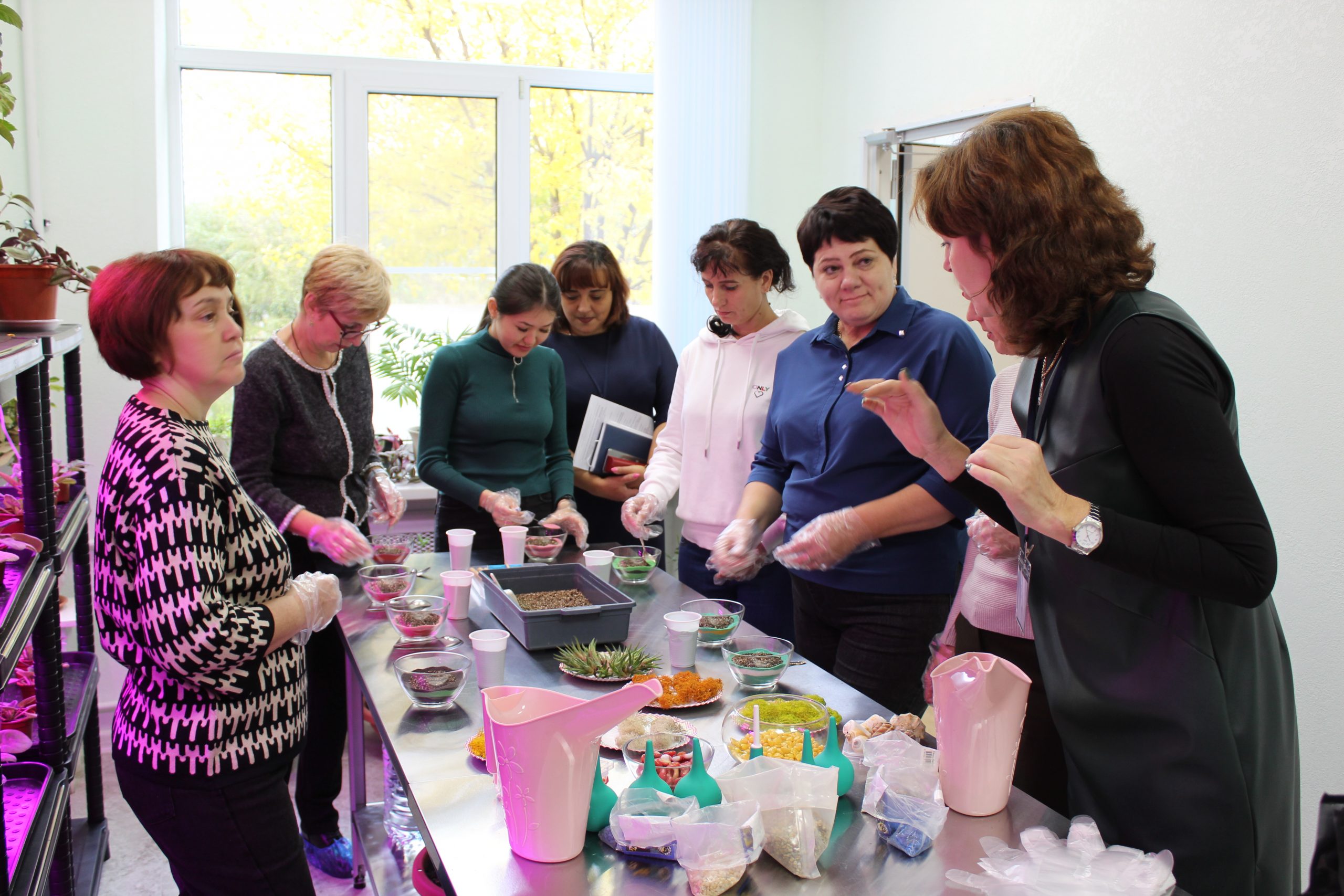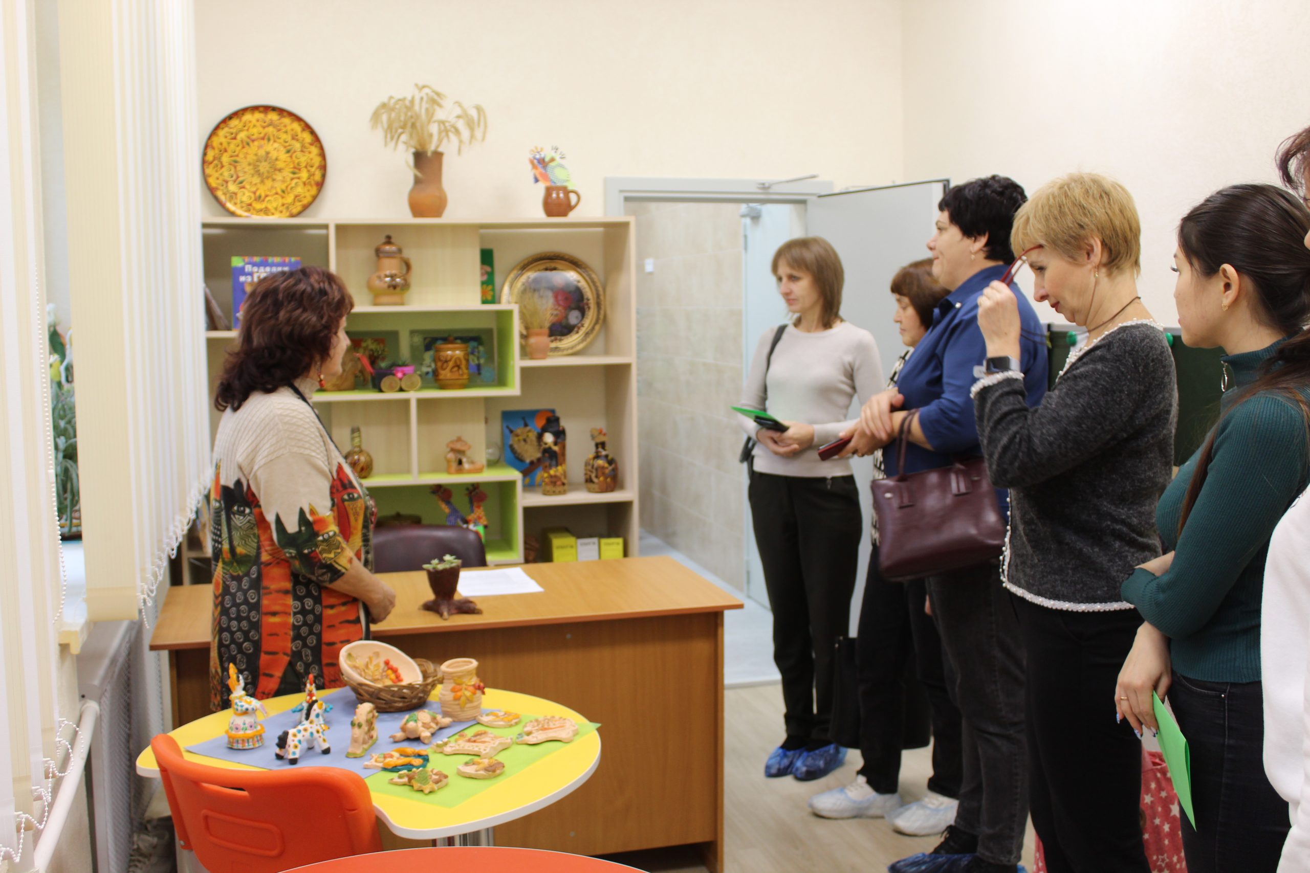 Для участников семинара — практикума была организована «Педагогическая экскурсия в мастерские в рамках реализации мероприятия «Доброшкола» Федерального проекта «Современная школа». В ходе экскурсии, педагоги школы – интерната поделились опытом своей работы и представили ряд мастер-классов: «Выполнение декоративного кулона (гончарная мастерская)», «Фитодизайн интерьера. Флорариум (мастерская агропромышленного профиля)», «Выполнение рисунка жидкими обоями на гипсовой поверхности (мастерская строительного профиля)», «Выполнение стачных швов на швейной машинке (швейная мастерская)», «Использование модульного конструктора «UNIMAT» для отработки навыков работы на станках (мастерская рабочего по комплексному обслуживанию)», «Роль уроков ОСЖ в социальной адаптации детей с интеллектуальными нарушениями (кабинет ОСЖ)», «Формирование элементарных математических представлений у детей с тяжелыми и множественными нарушениями развития средствами пескотерапии и интерактивной сенсорной панели (кабинет дефектолога)», «Стимулирование процессов мышления с помощью тактильных упражнений (кабинет психолога), «Мозжечковая стимуляция. Использование Balametrics в работе логопеда (кабинет логопеда)».