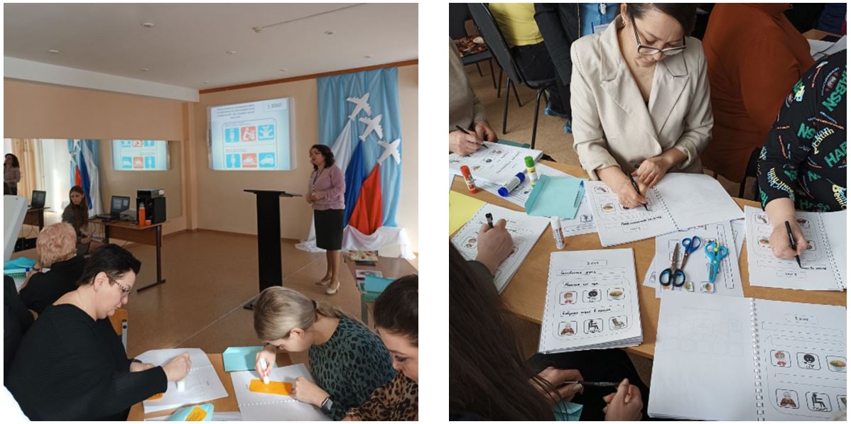 В процессе семинара участники получили возможность не только узнать теоретические концепты АДК (Н.В. Жуликова «Альтернативная и дополнительная коммуникация: от теории к практике») и технологии работы с фразовым конструктором (Е.В. Касьян «Технология применения средств альтернативной и дополнительной коммуникации в процессе формирования фразовой речи у обучающихся с различными вы формами УО»), но и смогли отработать эти приемы на практике, создав свою собственную рабочую тетрадь с практическими заданиями. Также слушателям был предложен практический опыт применения фразового конструктора в различных педагогических ситуациях: при изучении букваря в начальной школе, на уроках математики и окружающего мира, при организации образовательного процесса у обучающихся индивидуально на дому, а также в работе специалистов службы сопровождения – логопедов, дефектологов, психологов.