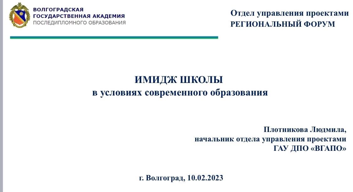 10 февраля 2023 года в дистанционном формате состоялся региональный форум «Имидж школы в условиях современного образования». На площадке форума встретились 137 общеобразовательных организаций Волгоградской области, 12 из них представили лучшие практики формирования имиджа в школе.