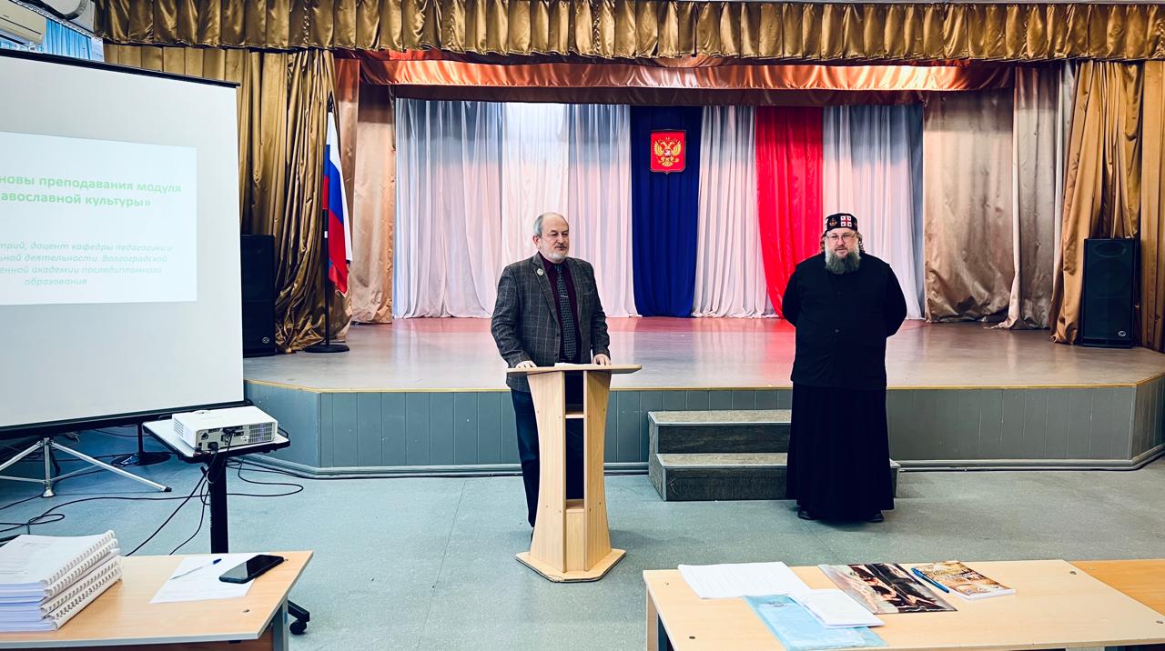 24 марта, в Красноармейском районе Волгограда началось обучение педагогов ориентированных на преподавание модуля «Основы православной культуры» в четвертых классах в 2025/26 учебном году. Двадцать девять педагогов из 22 образовательных учреждений района на базе МОУ «Гимназия № 7 Красноармейского района г. Волгограда» приступили к обучению по дополнительной программе профессиональной подготовки «Предметное содержание и методика преподавания модуля «Основы православной культуры» в четвертом классе». Проведение курсов проходит в рамках соглашения между ГАУ ДПО «Волгоградская государственная академия последипломного образования» и Волгоградской епархией.