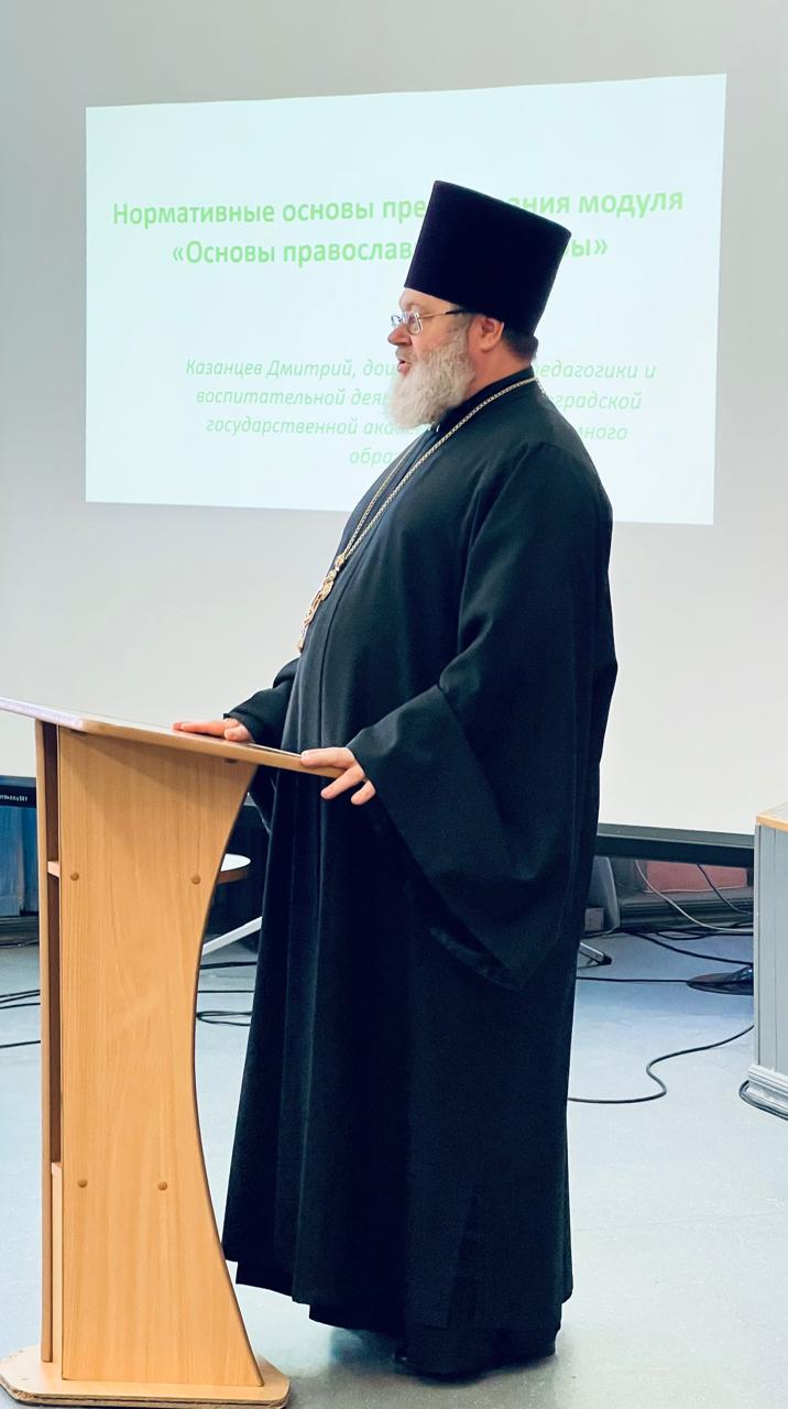 Первую лекцию слушателям прочитал доктор философских наук, профессор Дмитрий Владимирович Полежаев. Он провел анализ современного законодательства, нормативных основ, социальных предпосылок преподавания модуля «Основы православной культуры» и предложил рассматривать преподавание основ православной культуры как восхождение к конструктам национального, русского менталитета.