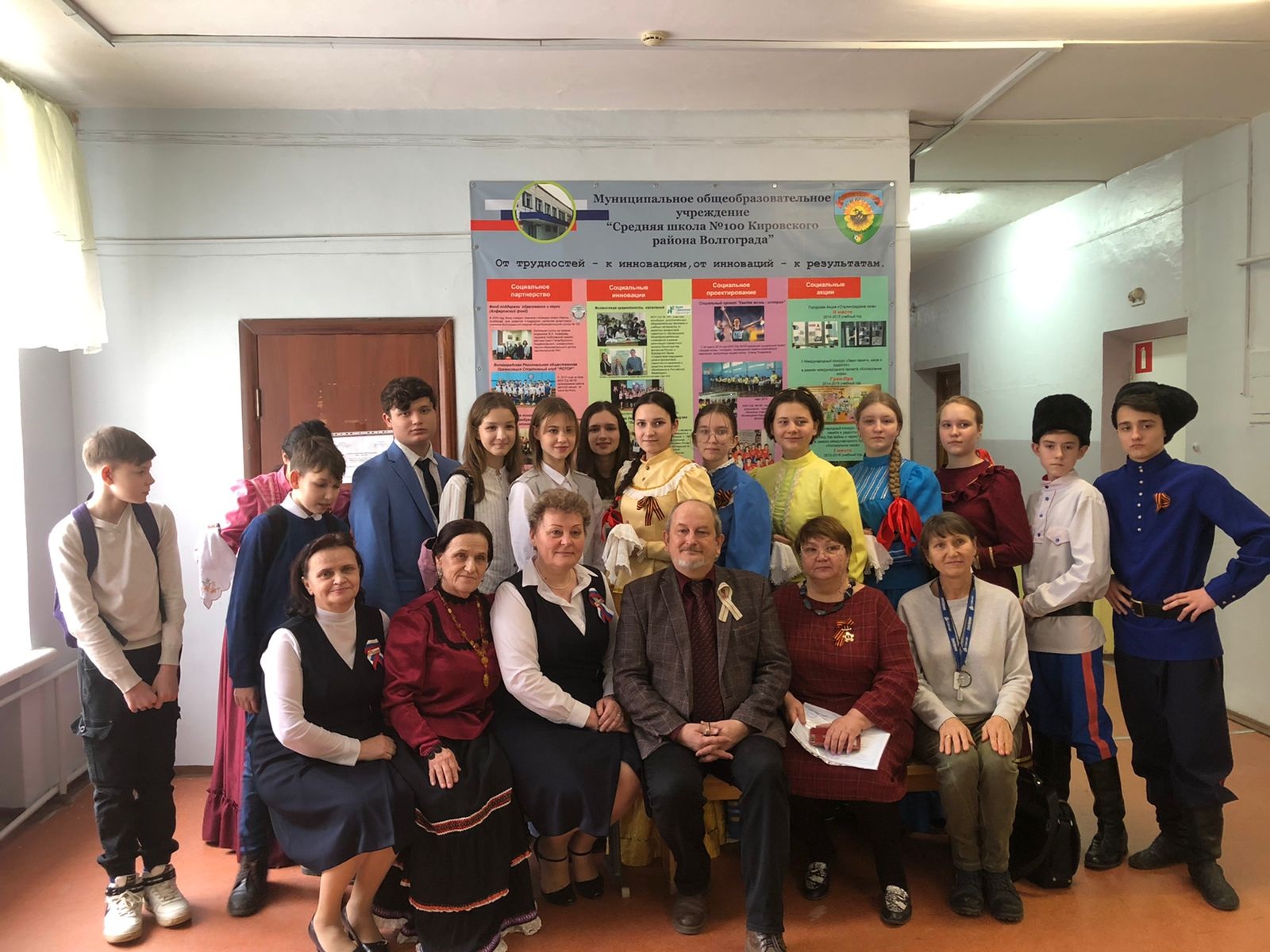 3 февраля 2023 г. на базе МОУ «СШ № 100» проведена организованная ресурсным центром гражданско-патриотического воспитания, кафедрой педагогики и воспитательной деятельности ГАУ ДПО «ВГАПО» и Волгоградским отделением ВОО «Ассоциация учителей истории и обществознания» при поддержке Волгоградской областной думы, Общественной палаты Волгоградской области, Волгоградской областной организации ветеранов (пенсионеров) войны, труда, Вооруженных сил и правоохранительных органов межрегиональная научно-практическая конференция, посвященная 80-летию Сталинградской Победы, «Особенности реализации регионального этнокультурного компонента воспитания средствами творческо-поисковой, учебно-исследовательской и социально-проектной работы».