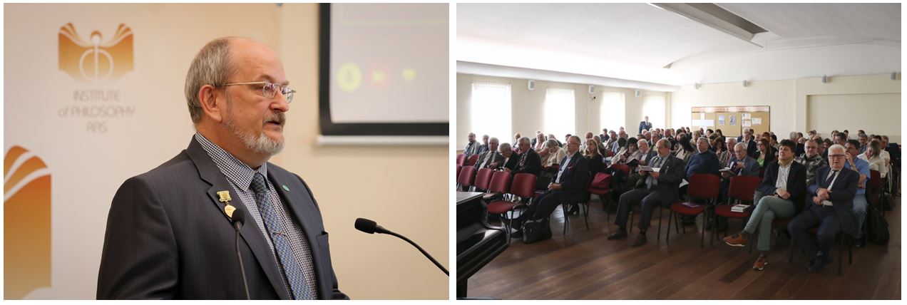 Профессор Д.В. Полежаев поблагодарил оргкомитет конференции, руководство Института философии РАН и Российское философское общество (в котором он состоит с 1997 г.) за высокое доверие выступить с пленарным докладом на столь значимом научно-образовательном событии. А также – за высокую честь взойти на трибуну после выступления профессора Д.И. Дубровского, главного докладчика, солдата-победителя, ветерана Великой Отечественной войны!