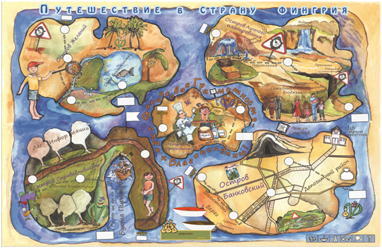 Модульная обучающая программа состоит из тематических модулей, которым соответствуют 5 островов, с расположенным на них государством «Фингрия». На каждом острове существуют свои географические артефакты, соответствующие отдельным темам модуля. Его «реалистичность» обеспечивается разработанными графическими и сувенирными материалами (бейсболки и футболки «путешественников», местная валюта), в числе которых также входит географическая карта. Получив такую карту, учащийся фиксирует на ней маршрут и отмечает свои достижения.