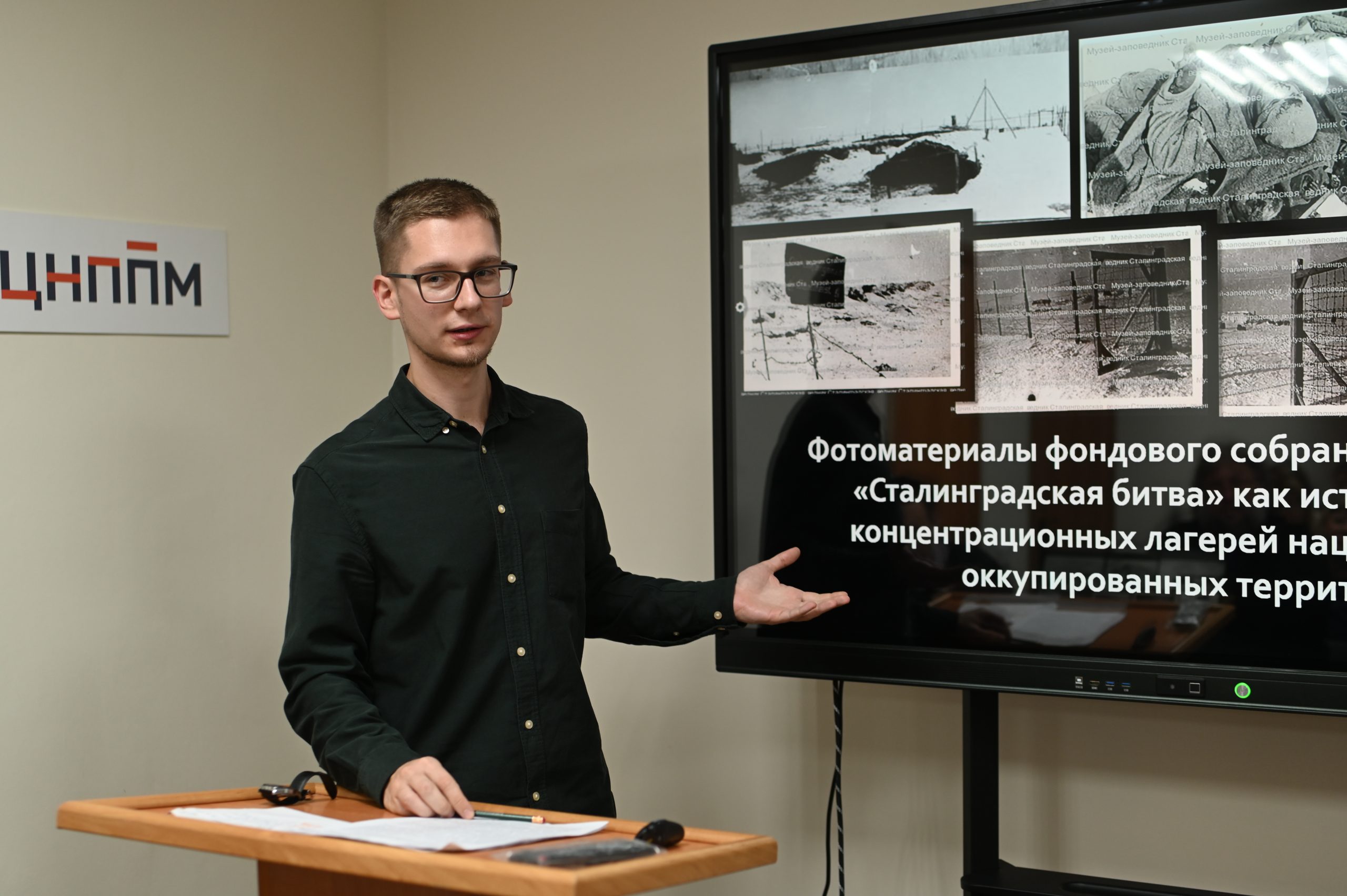 В пленарном докладе «Фотоматериалы фондового собрания Музея-заповедника «Сталинградская битва» как источник по изучению концентрационных лагерей нацисткой Германии на оккупированных территориях СССР» сотрудник ФГБУК «Государственный историко-мемориальный музей-заповедник «Сталинградская битва»» В.А. Смусев рассказал об особенностях хранения, маркировки и изучения хранящихся в архиве этого замечательного и величественного музея фотодокументов, раскрывающих трагические страницы истории Сталинградской битвы, связанные с судьбой советских военнопленных и гражданских перемещенных лиц. Виктор Алексеевич пригласил всех заинтересованных исследователей к активной работе с фондами музея-панорамы «Сталинградская битва».