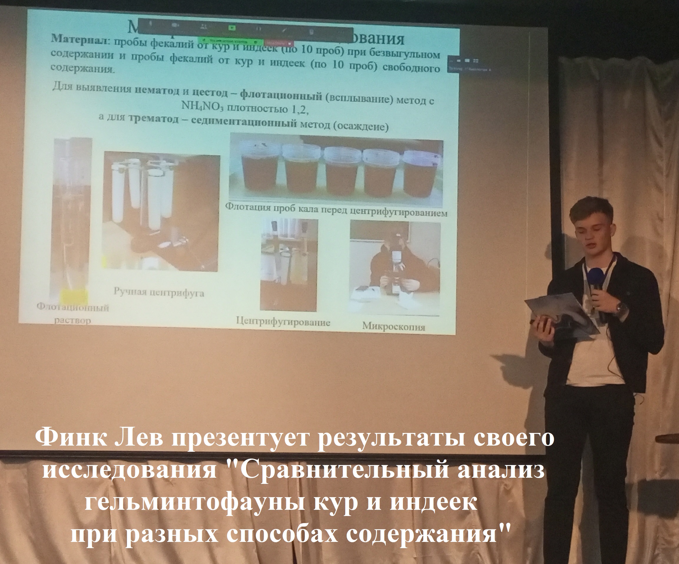 Биологическое направление представляли ученик 11 класса из средней школы № 10 г. Камышина Финк Лев (работа «Сравнительный анализ гельминтофаун кур и индеек при различных способах содержания», руководитель доцент каф. естественнонаучных дисциплин, информатики и технологии ВГАПО Степанчук Н.А.)