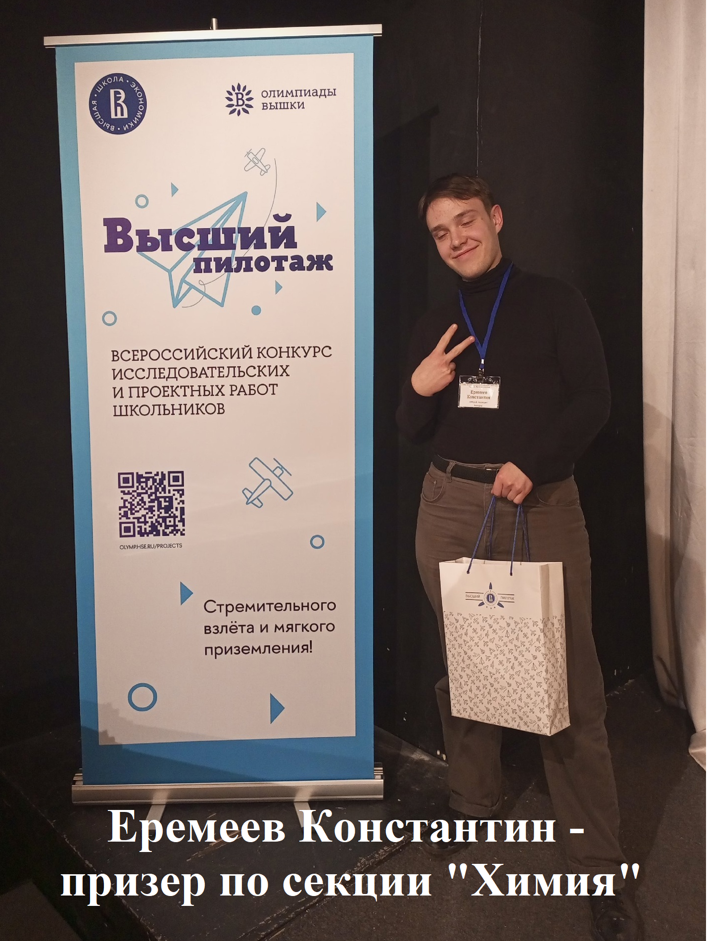 После завершения научных полемик с участием экспертов из ведущих ВУЗов страны были определены победители и призеры. Призером стал Еремеев Константин, выступающий в секции «Химия». Он достойно выдержал испытания и показал конкурентное преимущество среди 48 участников этого направления. Стоит отметить, что за три года участия учеников Волгоградской области в конкурсе «Высший пилотаж» это первая победа по направлению «Химия».