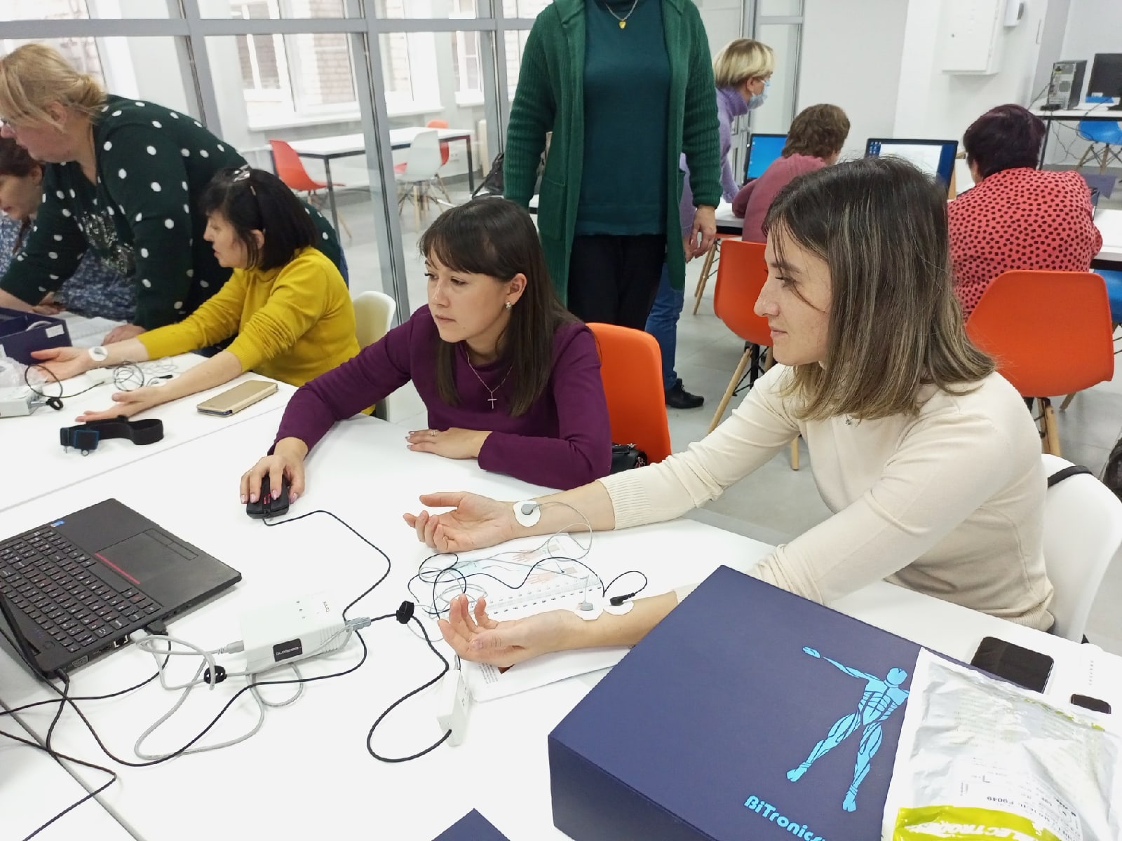 С учителями биологии работала доцент Маринина М.Г. Задача, поставленная для слушателей – использование оборудования в области электрофизиологии возбудимых тканей, была выполнена в полной мере. Слушатели научились выполнять электроэнцефалографию и анализировать полученные измерения, а также проводить электрокардиографическое исследование и интерпретировать электрокардиограммы.