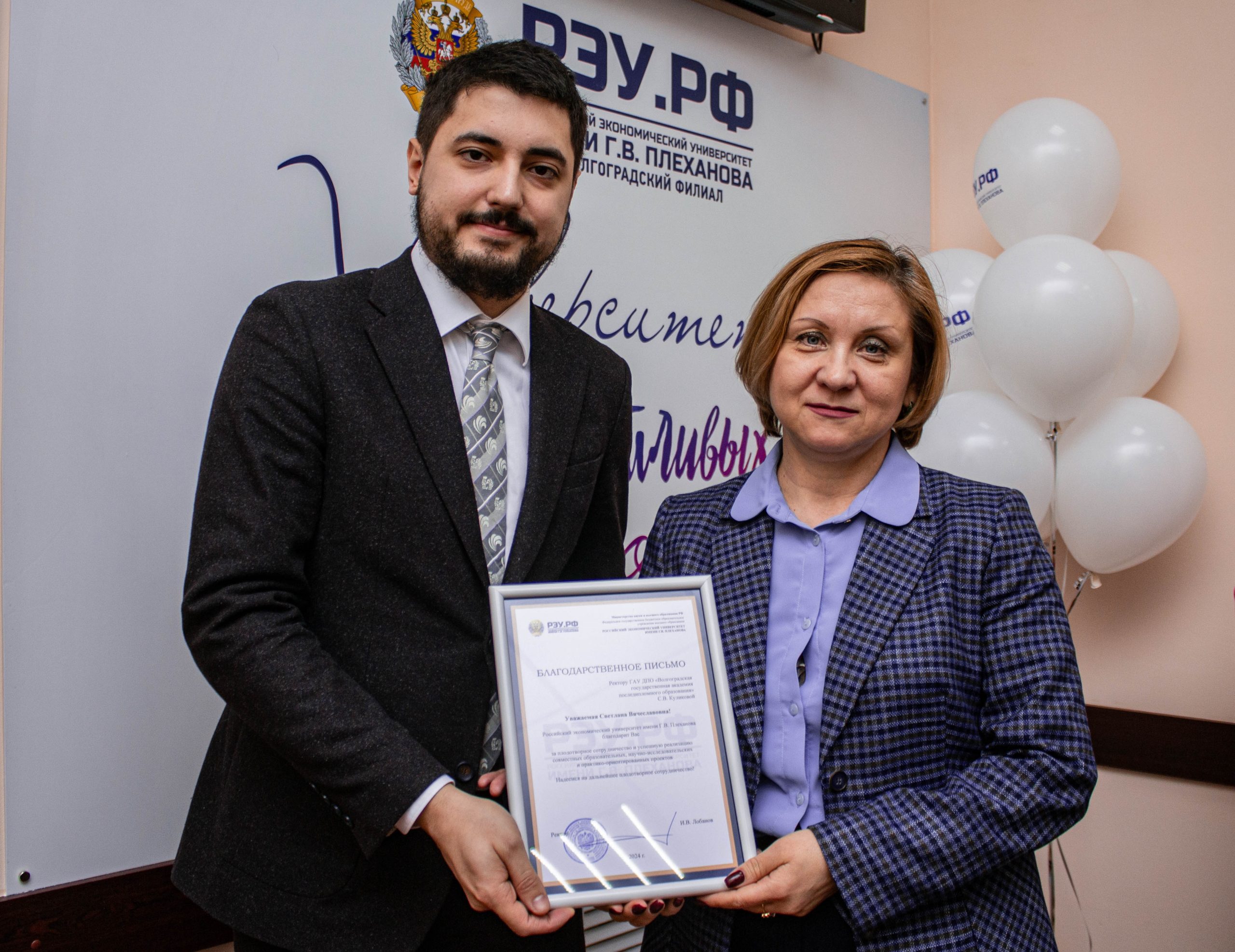 Директор центра по работе с филиалами ФГБОУ ВО «РЭУ им. Г.В. Плеханова» Матвей Егорович Шипилов вручил ректору ГАУ ДПО «ВГАПО» Куликовой Светлане Вячеславовне благодарственное письмо за плодотворное сотрудничество и успешную реализацию совместных образовательных, научно-исследовательских и практико-ориентированных проектов от имени ректора Российского экономического университета имени Г.В. Плеханова.