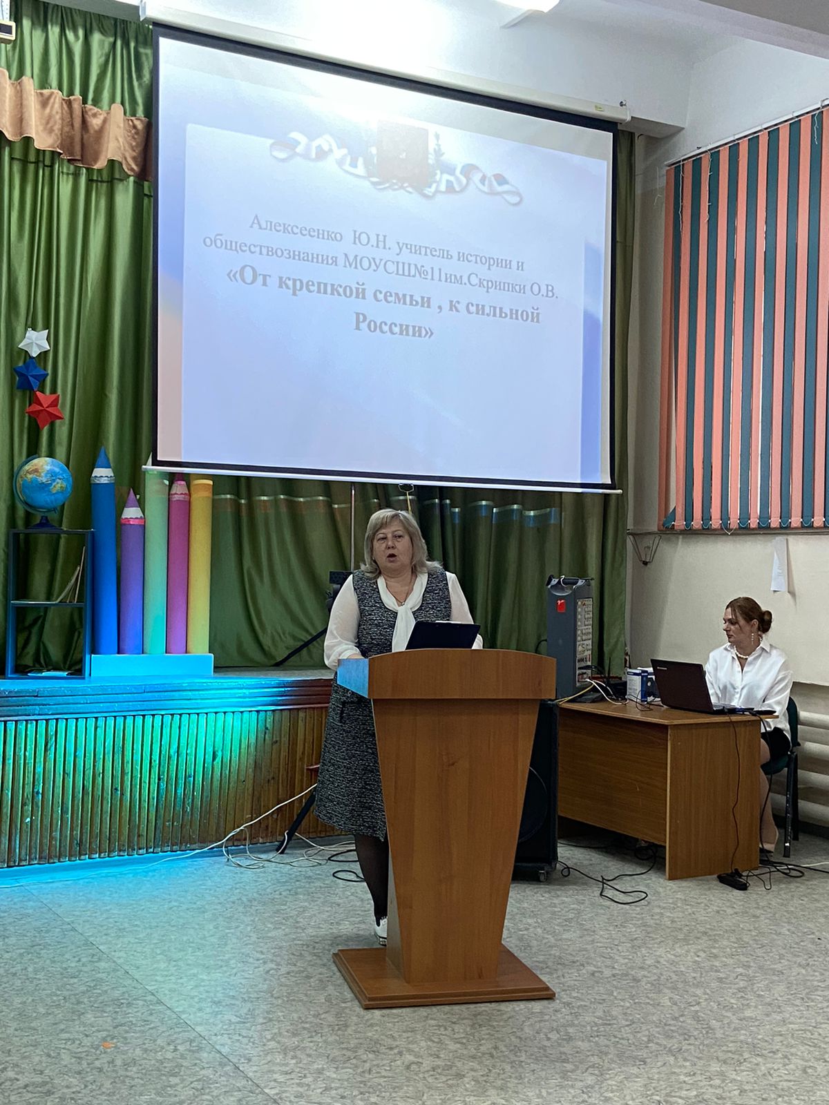 В пленарном докладе Алексеенко Юлии Николаевны, учителя истории и обществознания МОУ «СШ № 11 им. Скрипки О.В.» (г. Волжский, Волгоградская обл.) «От крепкой семьи – к сильной России» педагог рассказала о составленной ей и апробированной (в том числе на межрегиональной конференции, проведенной Волгоградским ресурсным центром гражданско-патриотического воспитания «Духовно-нравственное воспитание: опыт апробации образовательной модели» 17 мая 2024 года) программе семейного воспитания школьников. Автор достаточно подробно представила ее структуру и содержание, отметив актуальность ее реализации в повседневной жизни образовательной организации, в работе педагогов с родителями.