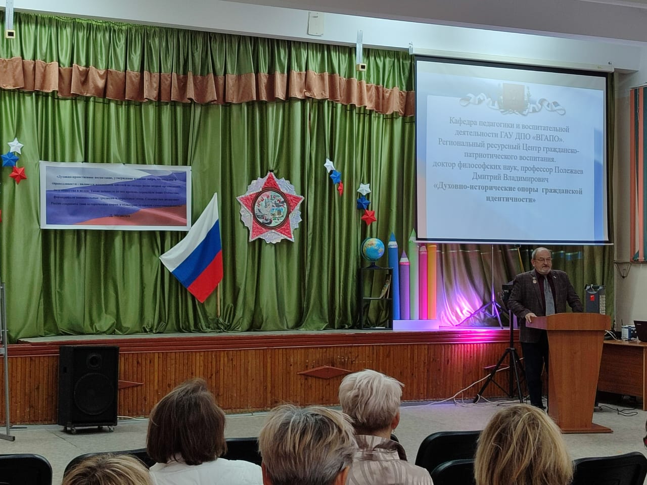 В рамках исполнения Указов Президента Российской Федерации В.В. Путина № 809 от 9 ноября 2022 г. «Об утверждении Основ государственной политики по сохранению и укреплению традиционных российских духовно-нравственных ценностей» и № 314 от 8 мая 2024 г. «Об утверждении Основ государственной политики Российской Федерации в области исторического просвещения» Волгоградский региональный ресурсный центр гражданско-патриотического воспитания, кафедра педагогики и воспитательной деятельности ГАУ ДПО «ВГАПО», Волгоградское региональное отделение «Ассоциации учителей истории и обществознания» при поддержке Калачевской епархии Русской Православной Церкви, Общественной палаты Волгоградской области, Комитета образования, науки и молодежной политики Волгоградской области, Волгоградской областной организации ветеранов (пенсионеров) войны, труда, Вооруженных Сил и правоохранительных органов и Волжского отделения политической партии «Единая Россия» 9 октября 2024 г. на базе МОУ «СШ № 11 им. Скрипки О.В.» г. Волжского Волгоградской области проведен межрегиональный научно-практический семинар «Духовно-исторические опоры общероссийской гражданской идентичности»