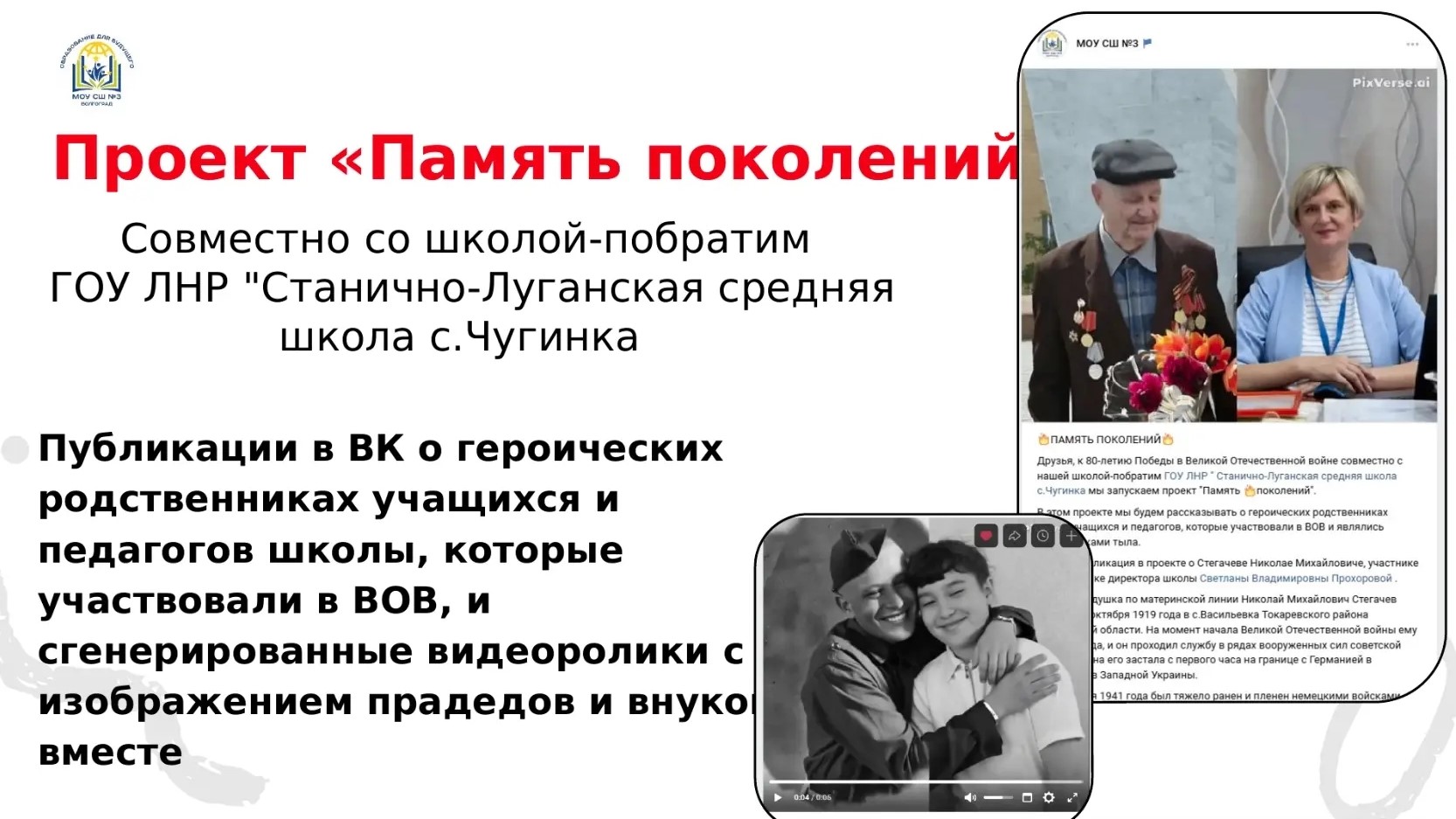 В этом проекте учащиеся и педагоги школ-побратим рассказали о героических родственниках наших учащихся и педагогов, которые участвовали в ВОВ или являлись тружениками тыла.