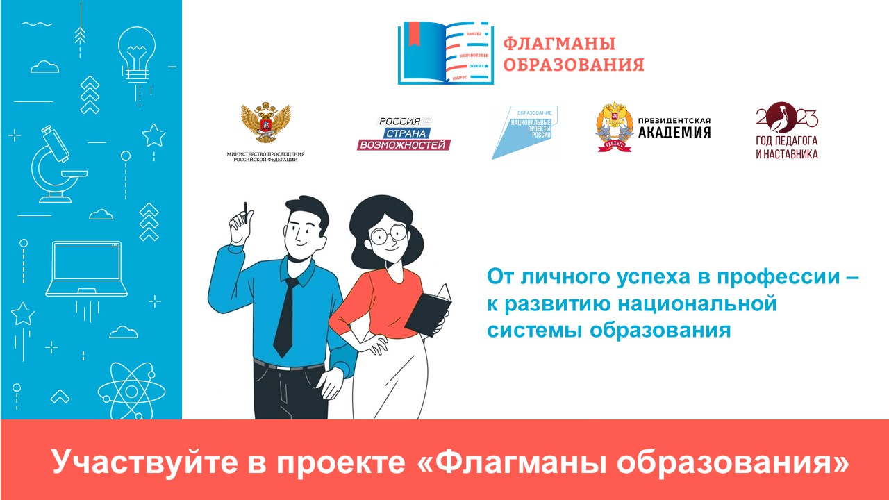 Продолжается заявочная кампания на участие в проекте «Флагманы образования» президентской платформы «Россия — страна возможностей». Проект проводится при поддержке Министерства просвещения Российской Федерации. Цель: создание условий формирования кадрового резерва для системы образования страны. Поддержка и выявление талантливых управленцев, мотивированных педагогов. Предоставление возможностей карьерного и профессионального развития, вовлечение студентов в педагогические профессии.