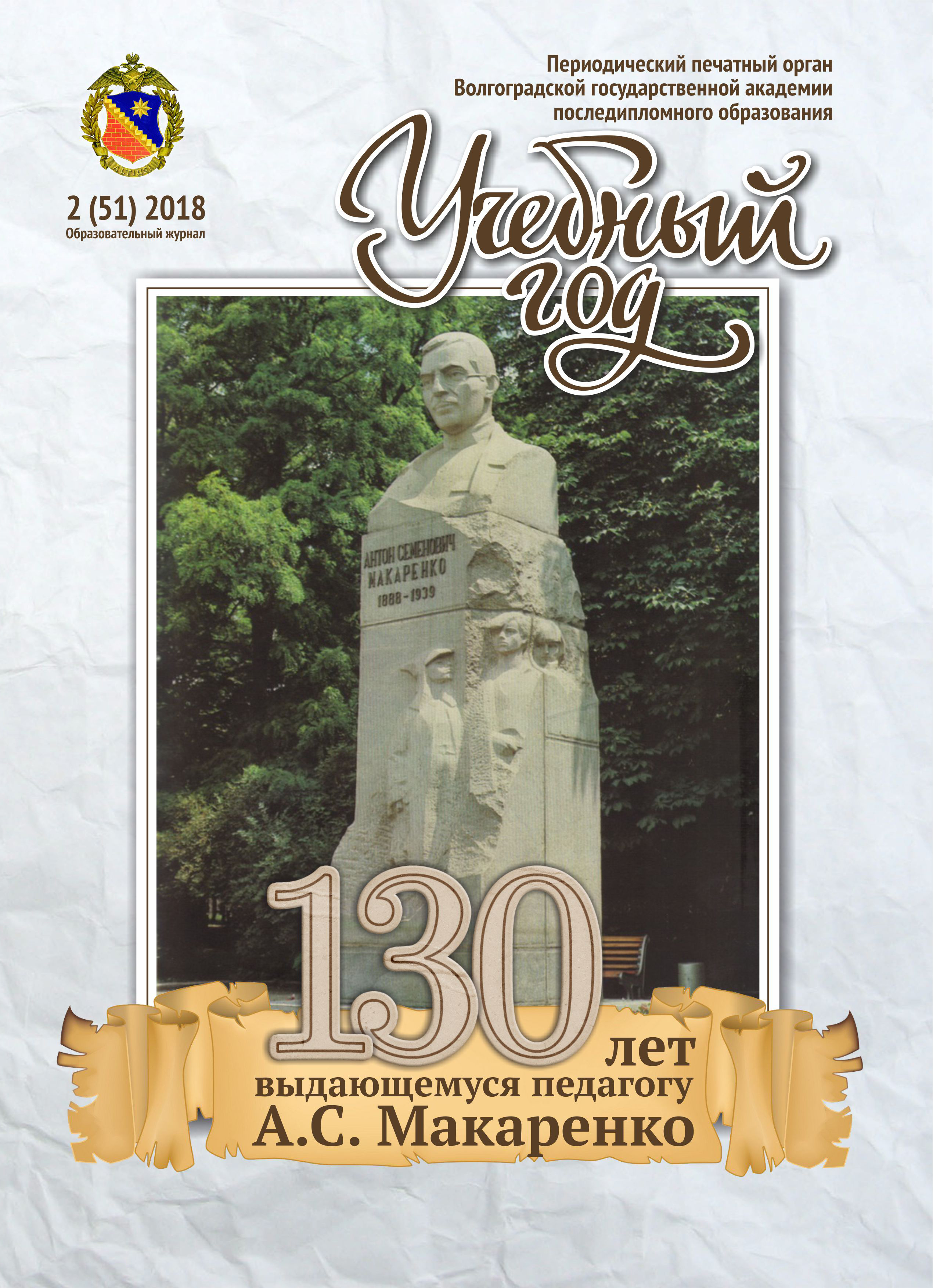 СОДЕРЖАНИЕ НОМЕРАКолонка главного редактора (стр. 3) С.В. Куликова Уважаемые читатели! «…материалы из опыта мы структурируем по рубрикам журнала, выстраивая их, в свою очередь, по ключевым направлениям развития и модернизации российского и, в том числе, волгоградского образования. Это такие направления, как: реализация в Волгоградской области «Стратегии развития воспитания в РФ на период до 2025 года», «Концепции дополнительного образования», федеральных предметных концепций (по математике, русскому языку и литературе, истории и др.), а также федеральных государственных образовательных стандартов дошкольного, начального, основного, среднего общего образования и профессиональных стандартов. 73 года со дня Великой Победы (стр. 5) Учительство в годы Великой Отечественной войны Великая Отечественная война <…> стала суровым испытанием для системы образования. Она проверила на прочность профессиональные и, что особенно важно, гражданские качества интеллигенции, в том числе учителей и преподавателей Преподаватели и студенты Сталинградского педагогического института в Великой Отечественной войне В 1944 году более пяти тысяч лучших учителей, преподавателей вузов и других работников образования были награждены медалями и орденами за самоотверженную работу по воспитанию и обучению подрастающего поколения. Реализуем Стратегию развития воспитания: патриотическое воспитание (стр. 10) С.В. Воротилова, А.А. Костина Фестиваль исторических плакатов «Неизвестные герои известной войны» Предложен поисковый по специфике деятельности проект и одновременно творческий по форме конечного продукта и способу его представления. Проект апробирован в 2016–2017 учебном году учащимися 6–8 классов МОУ СШ № 93 Советского района Волгограда. О.В. Белякова Детский фольклорно-спортивный праздник «Казацкие забавы» к Дню защитника Отечества для учащихся 5–7 классов Предложена разработка детского фольклорно-спортивного праздника «Казацкие забавы» к Дню защитника Отечества для учащихся 5–7 классов. Историко-педагогические юбилеи (стр. 15) Антон Семенович Макаренко: 130 лет со дня рождения Антон Семенович Макаренко был талантливым педагогом-новатором, одним из создателей стройной системы воспитания подрастающего поколения. Его имя широко известно в разных странах, его педагогический эксперимент, имеющий, по словам А.М. Горького, мировое значение, изучается повсюду. В марте 2018 года исполнилось 130 лет со дня его рождения. М.В. Заяц Центр развития социально-педагогических идей А.С. Макаренко В Волгоградской государственной академии последипломного образования с 23 марта 2017 года действует Центр развития социально-педагогических идей А.С. Макаренко. Цель его создания и деятельности – изучение идей и педагогического опыта А.С. Макаренко в сфере социального воспитания. А.Н. Кузибецкий А.С. Макаренко и В.А. Сухомлинский об управлении развивающимися образовательными системами на основе динамической коллективности Представлена инвариантная модель объекта-субъекта управления развивающимися образовательными системами на основе развития идеи А.С. Макаренко, В.А. Сухомлинского о динамической коллективности в контексте современных представлений о педагогических и управленческих полисубъектах. Реализуем Стратегию развития воспитания: физическое развитие и культ